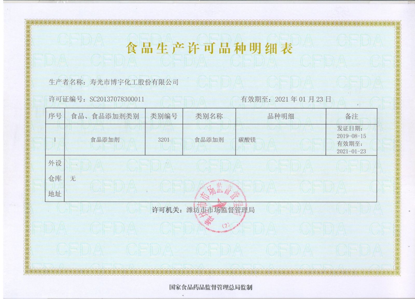 公司于2019年8月15日取得碳酸鎂食品級生產許可證書